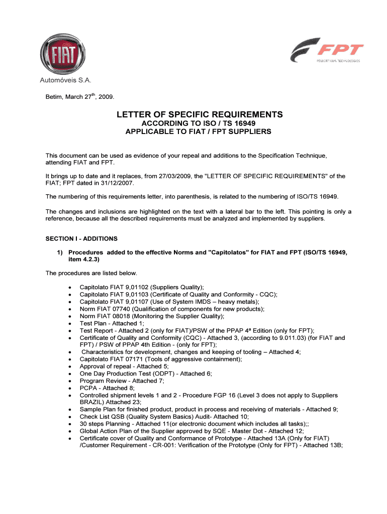 Atom was S.A. TH CETIM, March 27, 2009. LETTER OF SPECIFIC REQUIREMENTS ACCORDING TO ISO / TS 16949 APPLICABLE TO FIAT / FPT SUPPLIERS This document can be used as evidence of your repeal and additions
