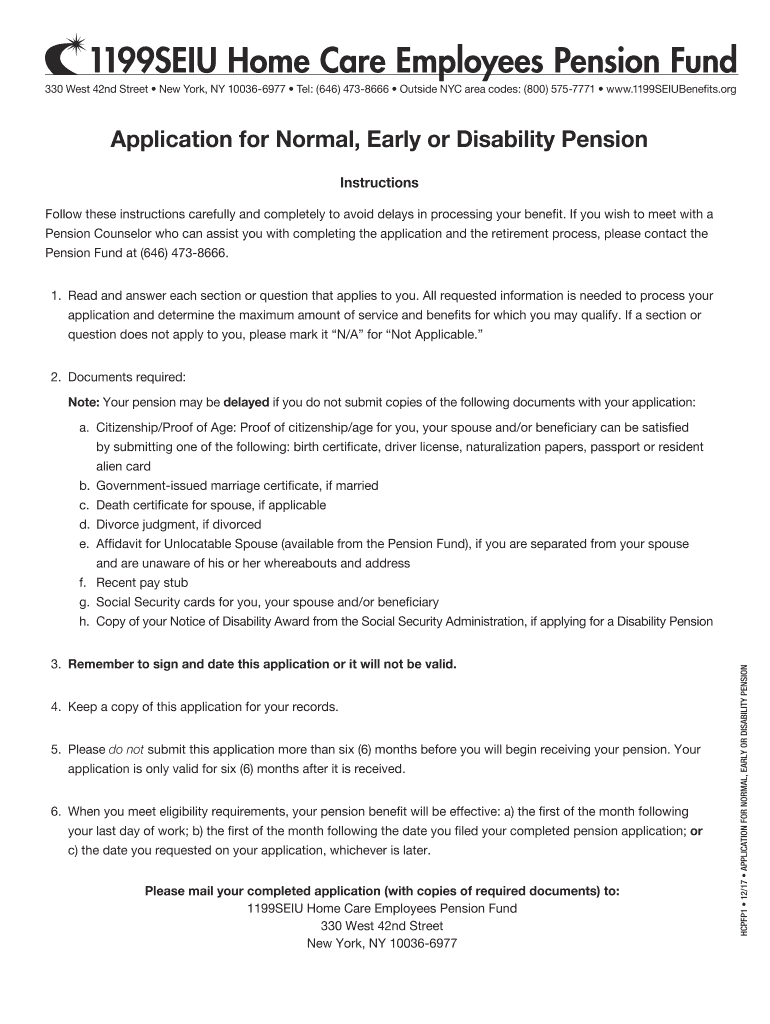 1199SEIU Home Care Employees Pension Fund 330 West 42nd Street New York, NY 100366977 Tel: (646) 4738666 Outside NYC area codes: (800) 5757771 www.1199SEIUBenefits.orgApplication for Normal, Early