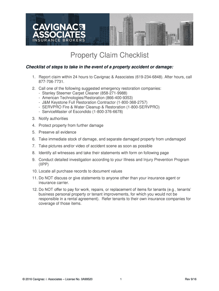 Property Claim Checklist of steps to take in the event of a property accident or damage: 1. Report claim within 24 hours to Cadillac & Associates (6192346848). After hours, call 8777067731. 2. Call