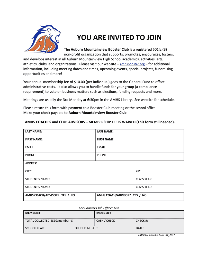 YOU ARE INVITED TO JOIN The Auburn Mountain View Booster Club is a registered 501(c)(3) nonprofit organization that supports, promotes, encourages, fosters, and develops interest in all Auburn Mountain