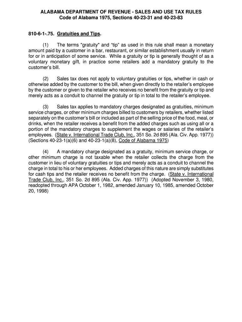 ALABAMA DEPARTMENT OF REVENUE SALES AND USE TAX RULES Code of Alabama 1975, Sections 402331 and 402383 81061.75. Gratuities and Tips. (1) The terms “gratuity and tip as used in this rule shall mean