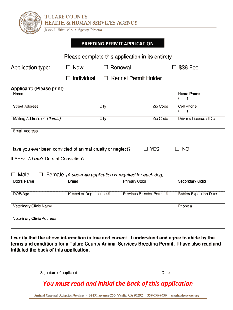 Get the free Breeder Permit Application - Tulare County Animal Services