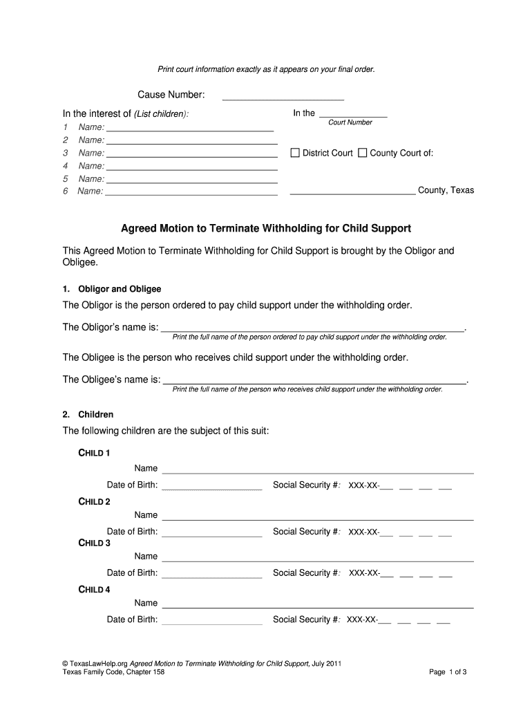 How to Fill Out the Agreed Motion to Terminate Withholding for Child Support Online