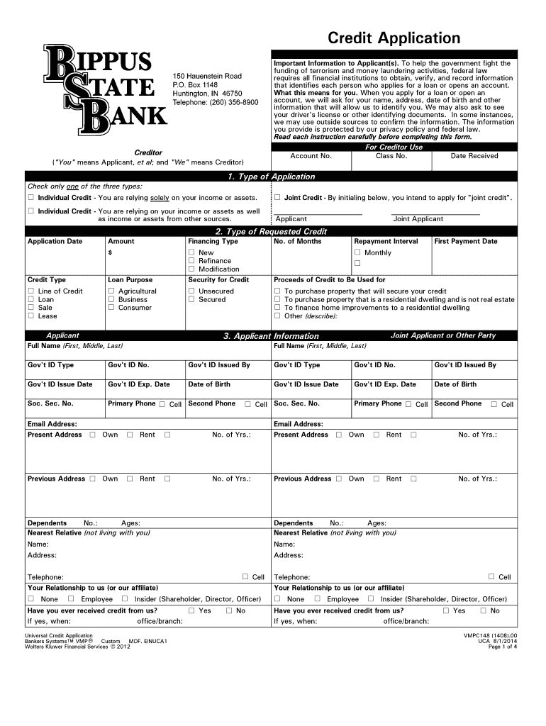 Outpointing RequirementsResetShow Field BordersCredit Application