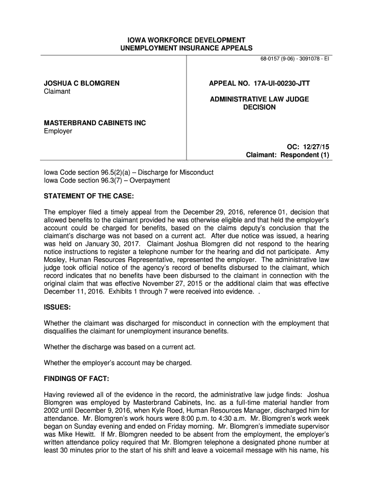 IOWA WORKFORCE DEVELOPMENT UNEMPLOYMENT INSURANCE APPEALS 680157 (906) 3091078 JOSHUA C BLOGGER ClaimantAPPEAL NO. 17AUI00230JTT ADMINISTRATIVE LAW JUDGE DECISIONMASTERBRAND CABINETS INC Employer