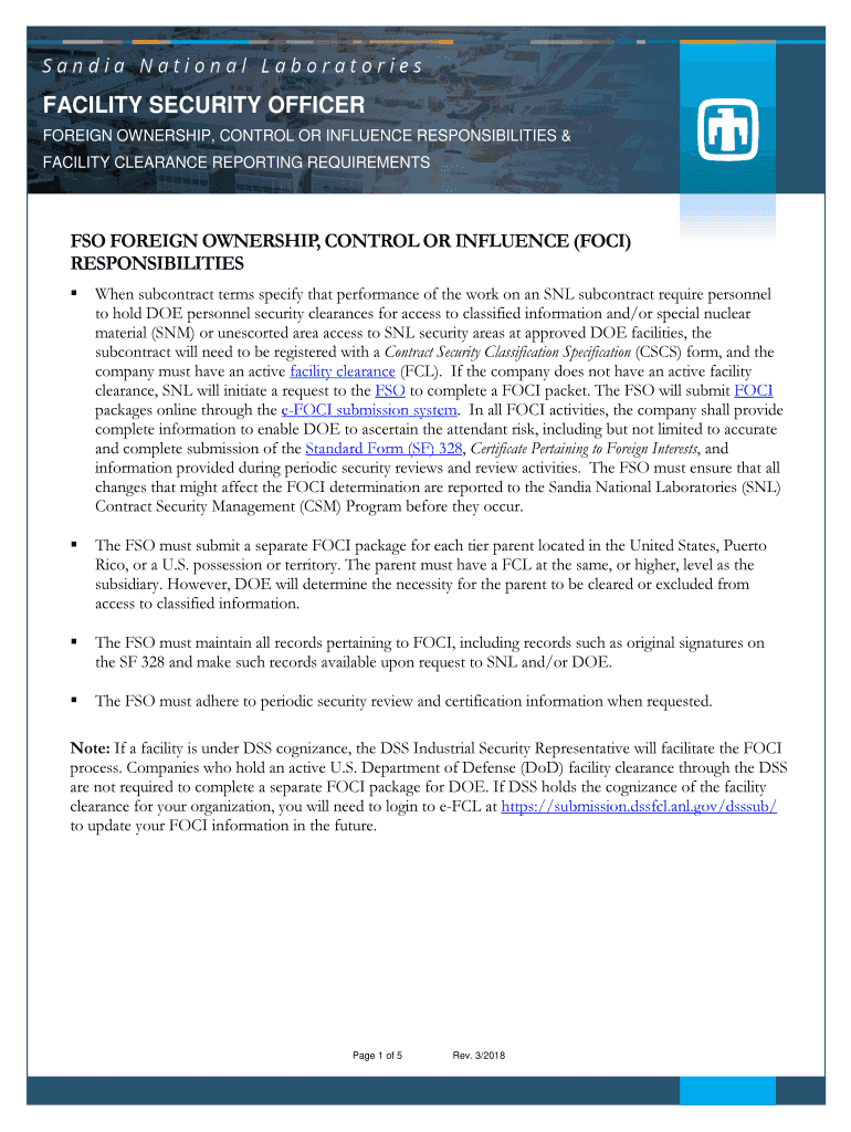 FACILITY SECURITY OFFICER FOREIGN OWNERSHIP, CONTROL OR INFLUENCE RESPONSIBILITIES & FACILITY CLEARANCE REPORTING REQUIREMENTS FOREIGN OWNERSHIP, CONTROL OR INFLUENCE (LOCI) RESPONSIBILITIES When