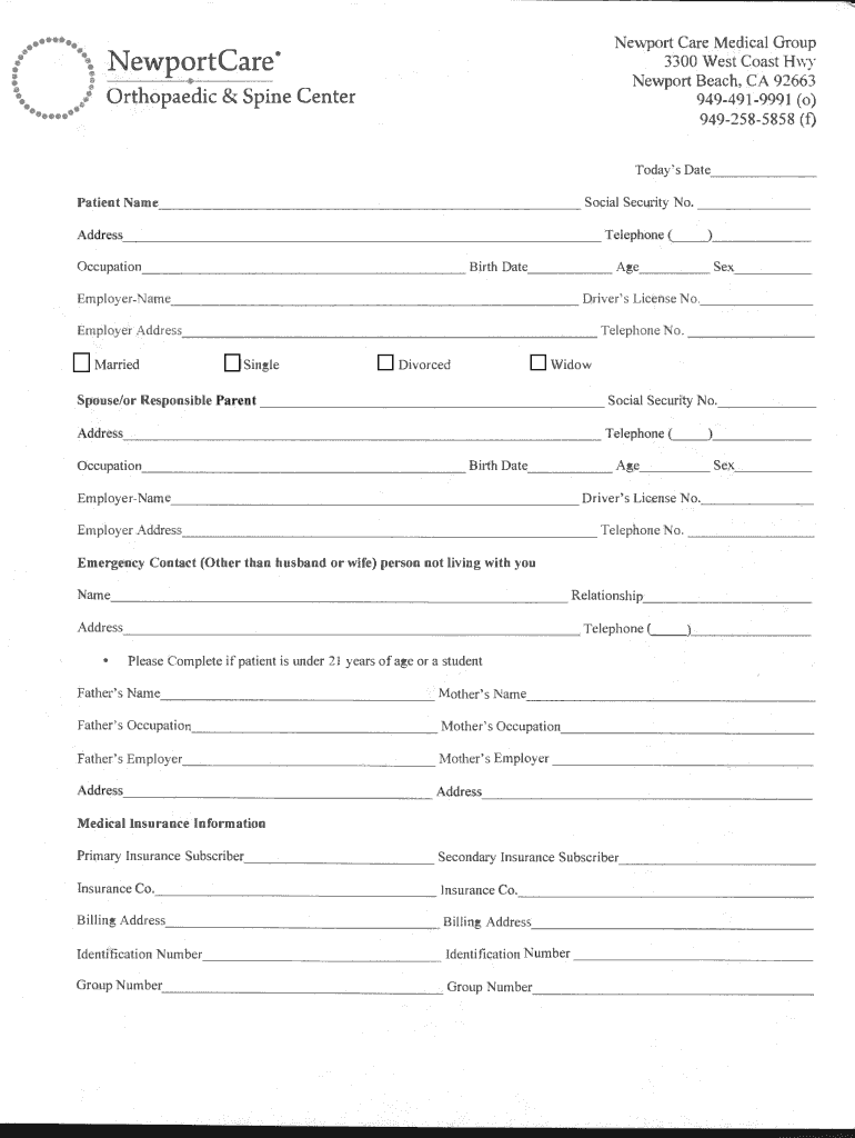 . Newport Care Medical GroupNewportCare×3300 West Coast Hwy Newport Beach, CA 92663Orthopaedic & Spine Center9494919991 9492585858(o) (f)Today's Date Patient Name. Social Security No. Address. Occupation