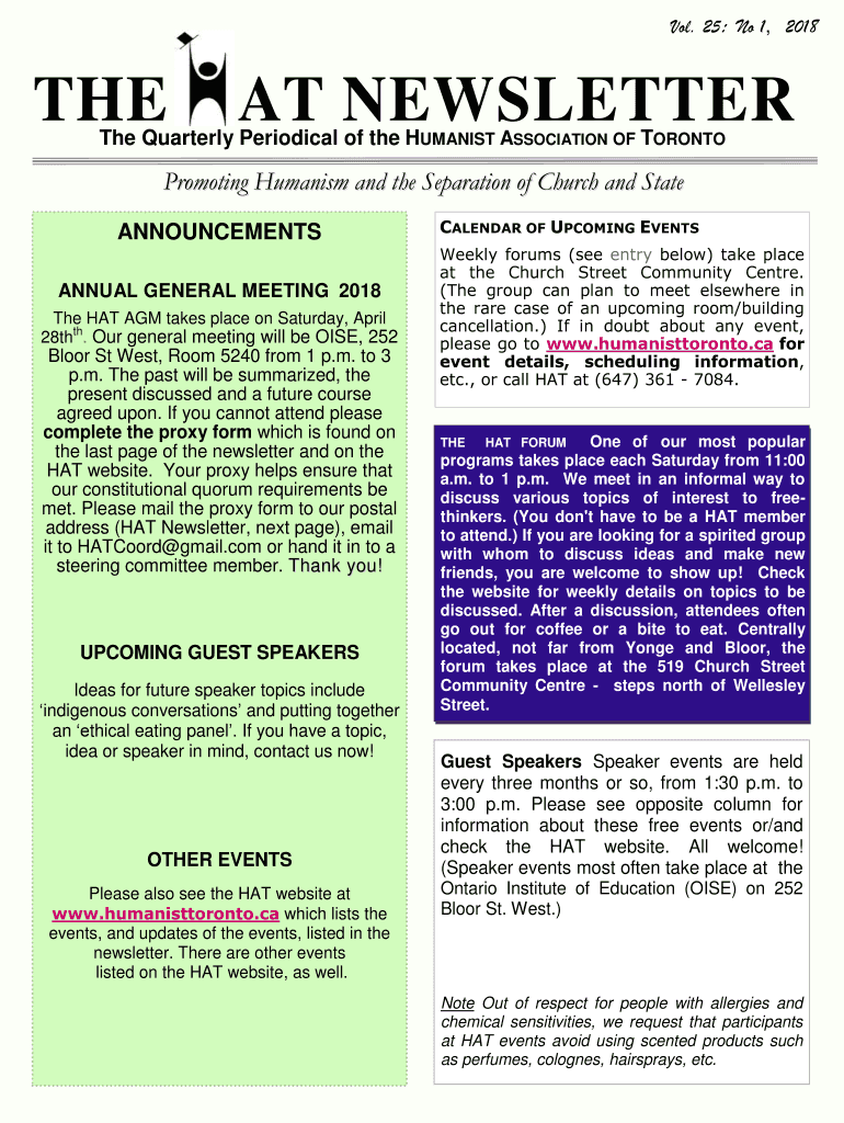 Vol. 25: No 1, 2018THEAT Newsletter Quarterly Periodical of the HUMANIST ASSOCIATION OF TORONTOPromoting Humanism and the Separation of Church and State