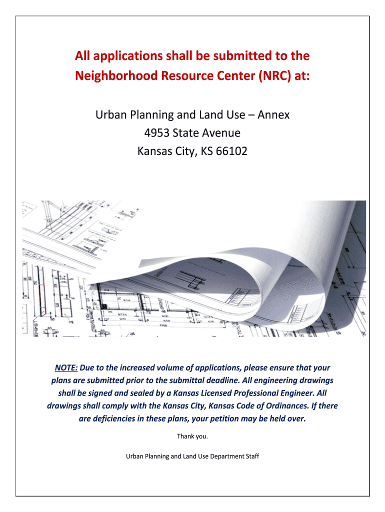 All applications shall be submitted to the Neighborhood Resource Center (NRC) at: Urban Planning and Land Use Annex 4953 State Avenue Kansas City, KS 66102NOTE: Due to the increased volume of applications,