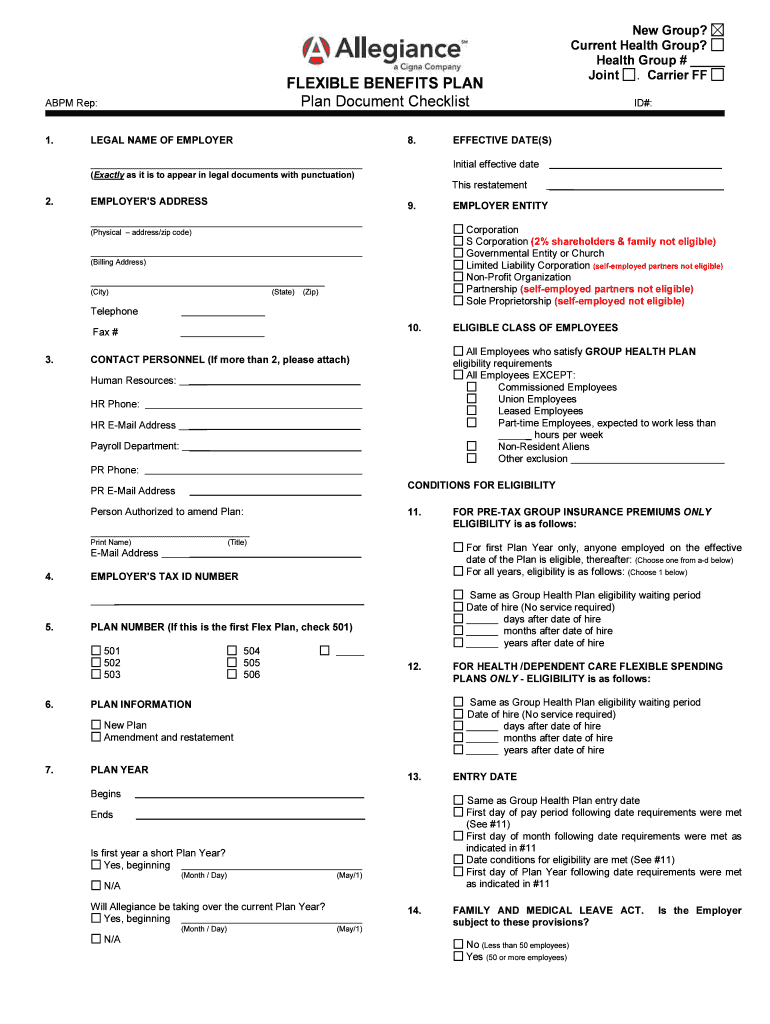 FLEXIBLE BENEFITS PLAN Document ChecklistABPM Rep:1.LEGAL NAME OF EMPLOYER8. New Group? Current Health Group? Health Group # Joint. Carrier FF ID#:EFFECTIVE DATE(S) Initial effective date(Exactly