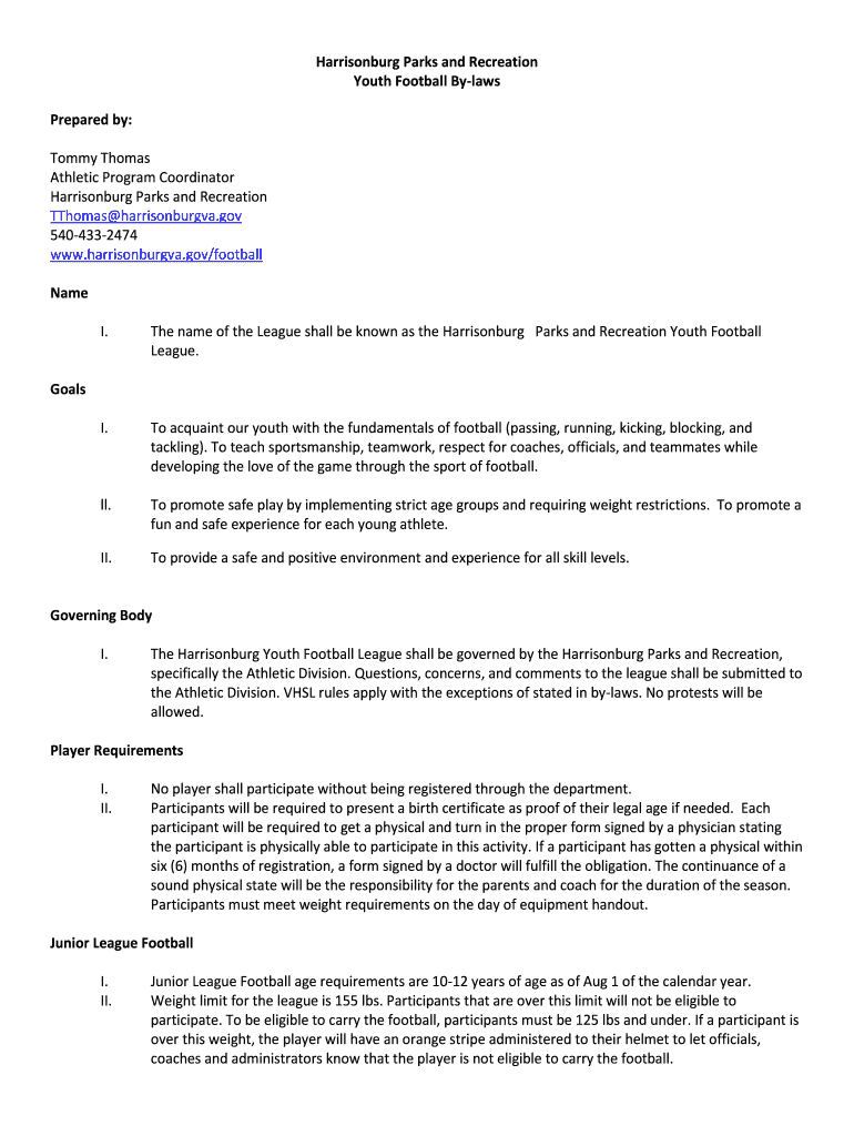 Get the free Harrisonburg Parks and Recreation Youth Football By-laws ...