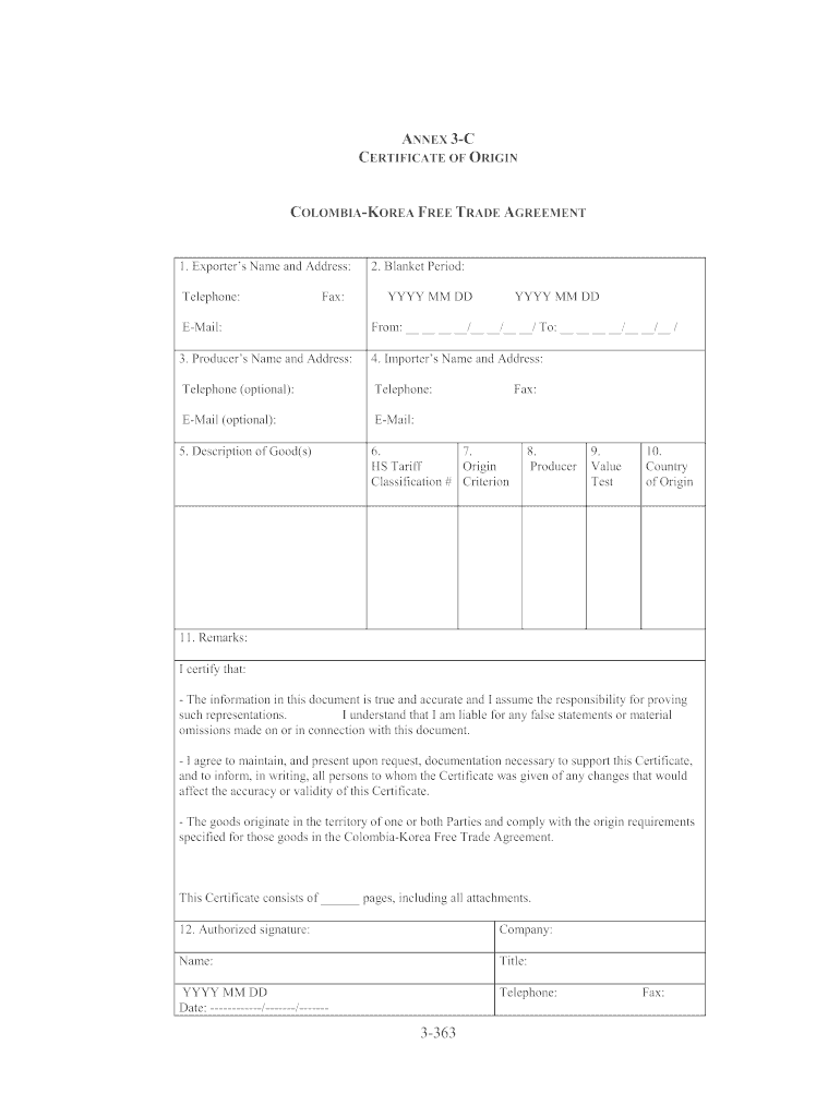 ANNEX 3C CERTIFICATE OF ORIGINCOLOMBIAKOREA FREE TRADE AGREEMENT1. Exporters Name and Address: Telephone:Fax:2. Blanket Period: YYY MM DRYLY MM Email:From: / / / To: / / /3. Producers Name and Address:4.
