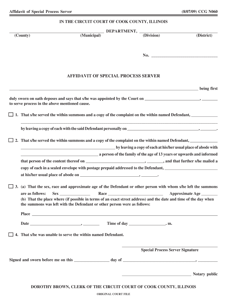 The Affidavit of Special Process Server is a legal document used by process servers to certify the service of legal documents in Illinois.