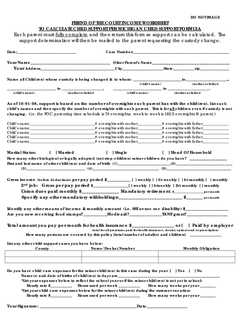 The Friend of the Court Income Worksheet is a legal form used by parents in Michigan to calculate child support obligations based on the Michigan Child Support Formula.