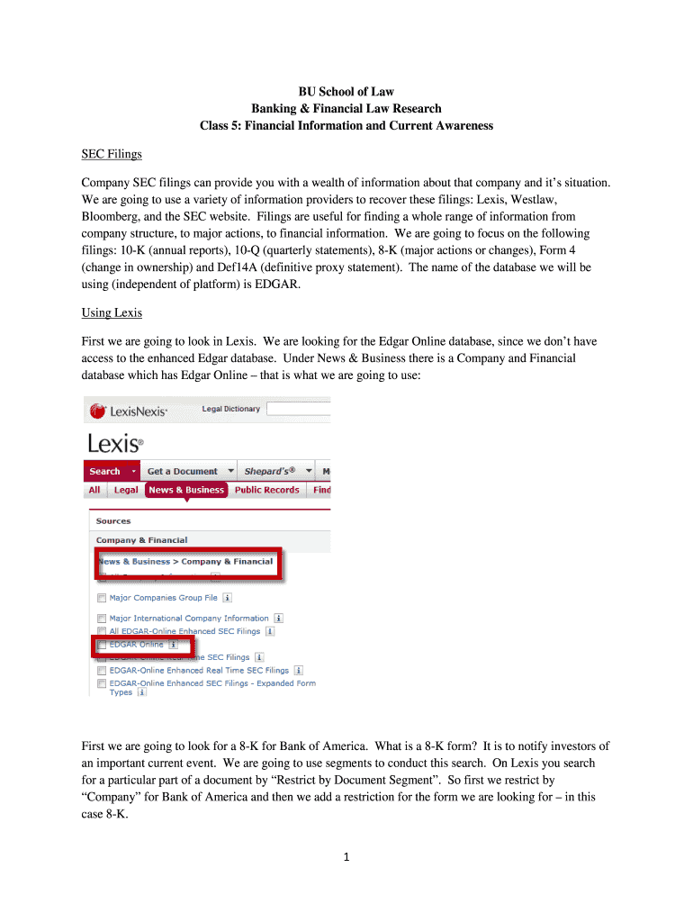 BU School of Law Banking & Financial Law Research Class 5: Financial Information and Current Awareness SEC Filings Company SEC filings can provide you with a wealth of information about that company