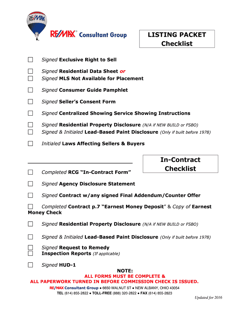 LISTING PACKET Checklist Signed Exclusive Right to Sell Signed Residential Data Sheet or Signed MLS Not Available for Placement Signed Consumer Guide Pamphlet Signed Sellers Consent Form Signed Centralized