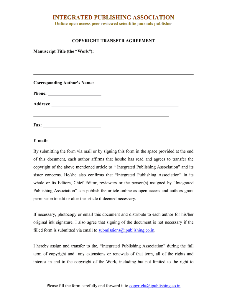 INTEGRATED PUBLISHING ASSOCIATION Online open access peer reviewed scientific journals' publisher COPYRIGHT TRANSFER AGREEMENT Manuscript Title (the Work): Corresponding Authors Name: Phone: Address: