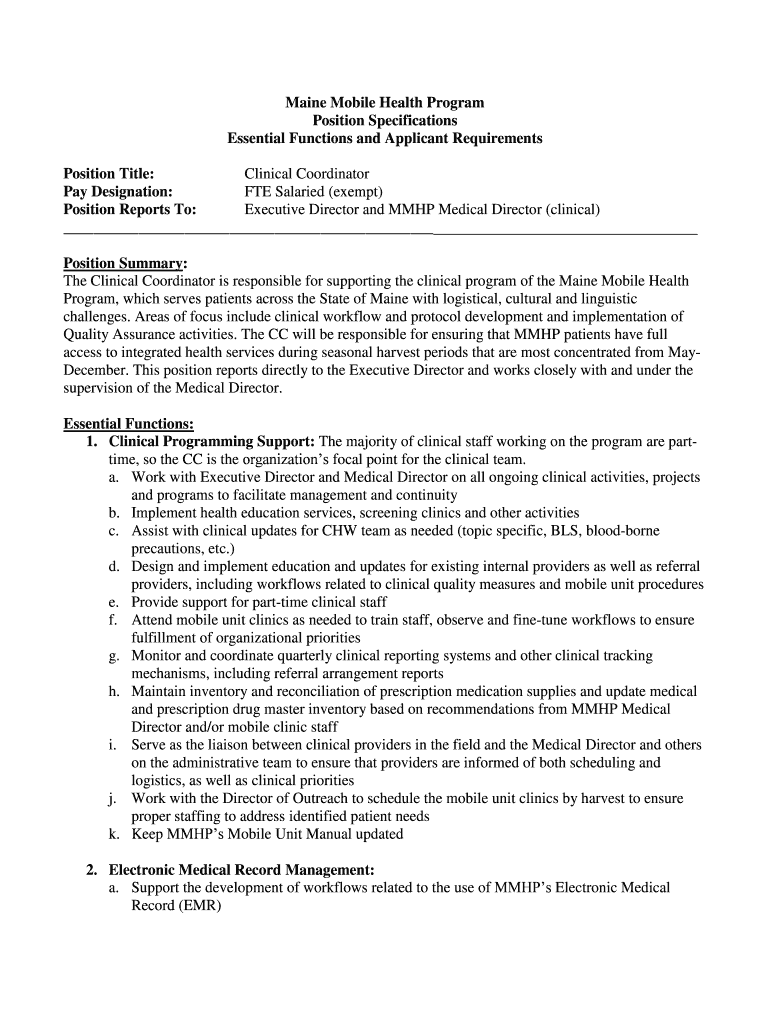 Maine Mobile Health Program Position Specifications Essential Functions and Applicant Requirements Position Title: Clinical Coordinator Pay Designation: FTE Salaried (exempt) Position Reports To: