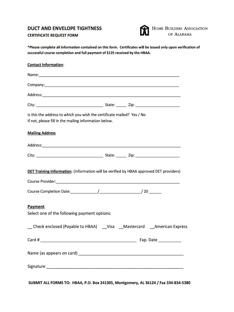 DUCT AND ENVELOPE TIGHTNESS CERTIFICATE REQUEST FORM *Please complete all information contained on this form. Certificates will be issued only upon verification of successful course completion and