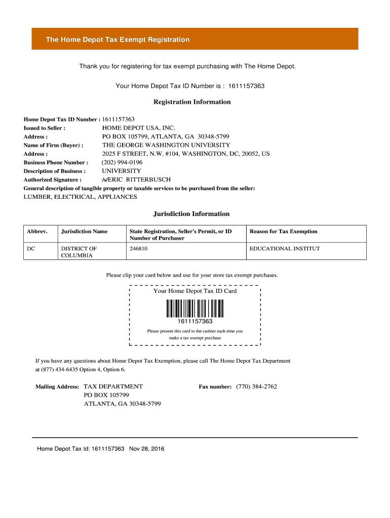 The Home Depot Tax Exempt RegistrationThank you for registering for tax-exempt purchasing with The Home Depot.