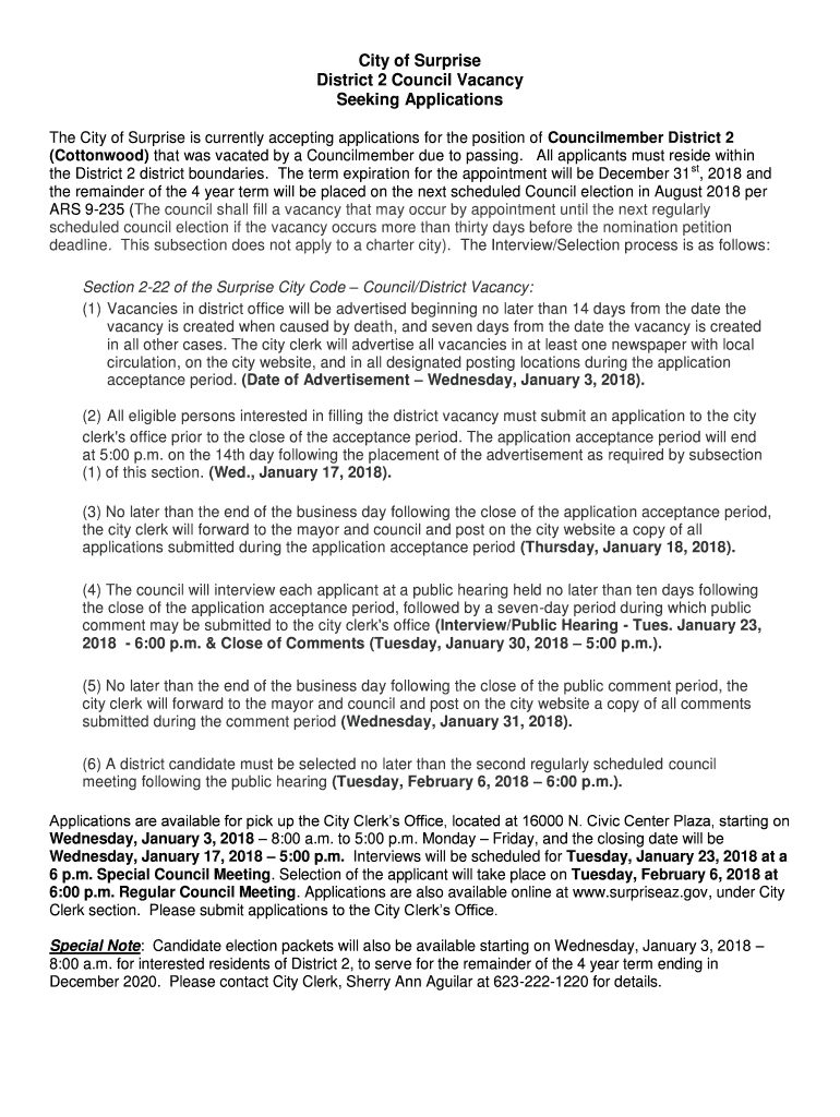 Get the free City of Surprise District 2 Council Vacancy Seeking Applications