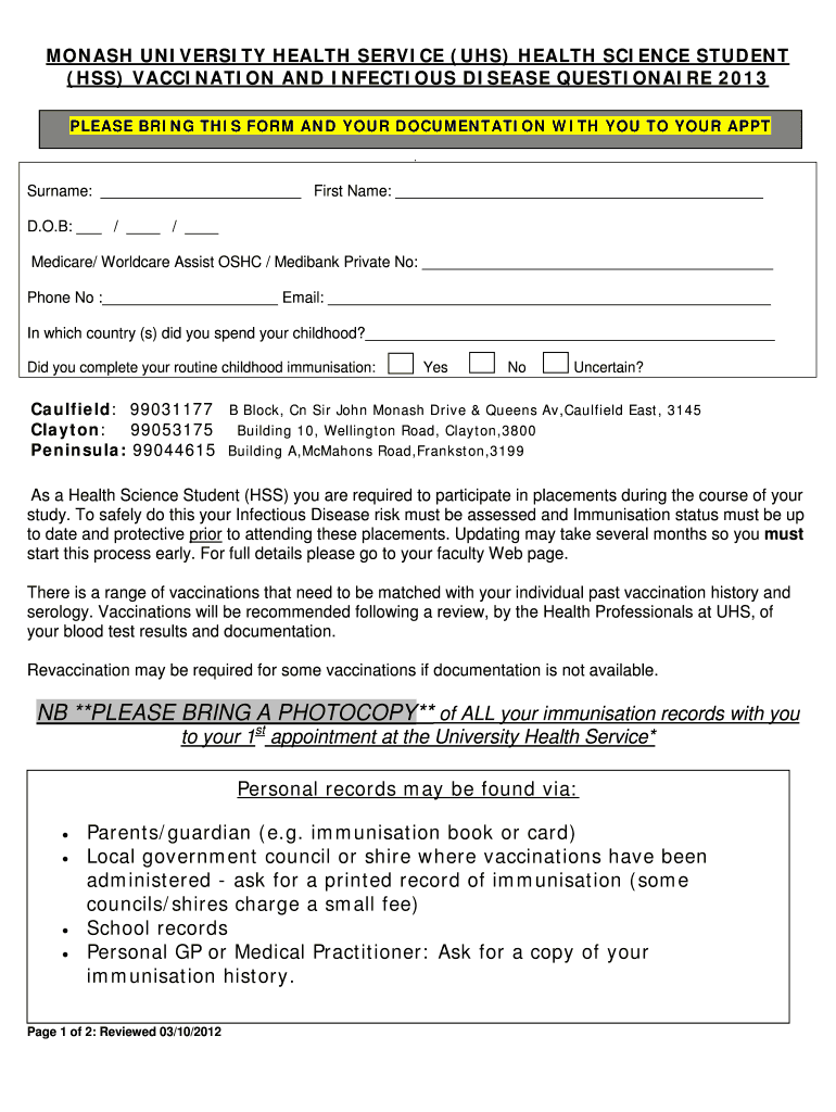 The Monash University Health Science Student Vaccination Questionnaire is designed specifically for health science students to evaluate their immunity status and potential infectious disease risks. This form is significant as it ensures that students meet essential health requirements necessary for clinical placements. By using the Monash University Health Science Student Vaccination Questionnaire, students can proactively manage their health, which is crucial for both their safety and that of their future patients.