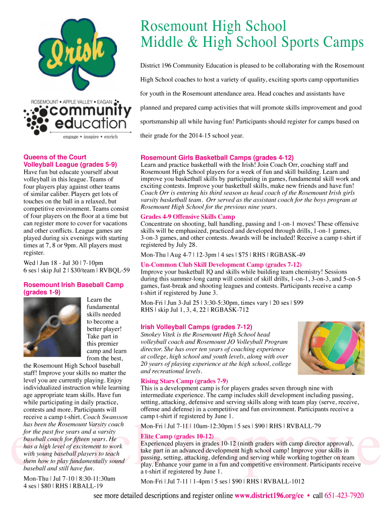 Rose mount High School Middle & High School Sports Camps District 196 Community Education is pleased to be collaborating with the Rose mount High School coaches to host a variety of quality, exciting