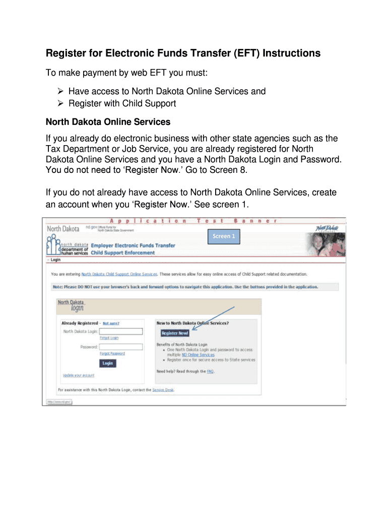 Register for Electronic Funds Transfer (EFT) Instructions To make payment by web EFT you must: Have access to North Dakota Online Services and Register with Child Support North Dakota Online Services