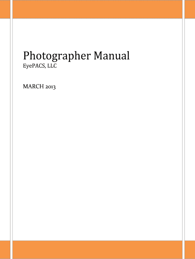 Photographer ManualEyePACS, LLCMARCH2013 EYE PACS, LLCPHOTOGRAPHERMANUAL TABLEOFCONTENTS pg.1 PhotographerandPatientCommunication. Pg.2 GeneralInformationaboutDiabeticRetinopathypg.3 WhatisDiabeticRetinopathy?