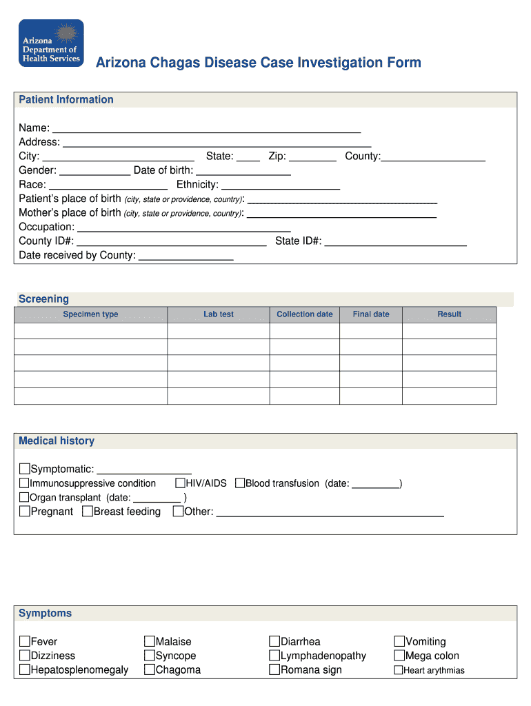 Anyone who has been diagnosed with or suspects they may have Chagas disease in Arizona needs to fill out the Arizona Chagas Disease case form.