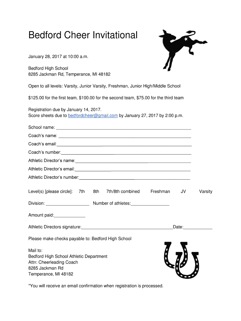 Bedford Cheer Invitational January 28, 2017, at 10:00 a.m. Bedford High School 8285 Jackman Rd, Temperance, MI 48182 Open to all levels: Varsity, Junior Varsity, Freshman, Junior High/Middle School