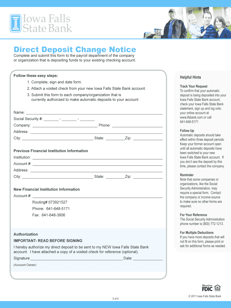 Get the free BDirect Deposit Changeb Notice - Iowa Falls State Bank