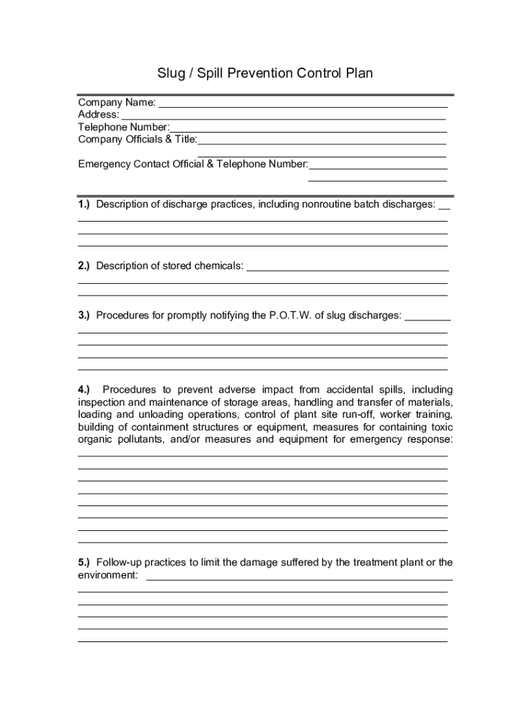Slug / Spill Prevention Control Plan Company Name: Address: Telephone Number: Company Officials & Title: Emergency Contact Official & Telephone Number: 1.) Description of discharge practices, including
