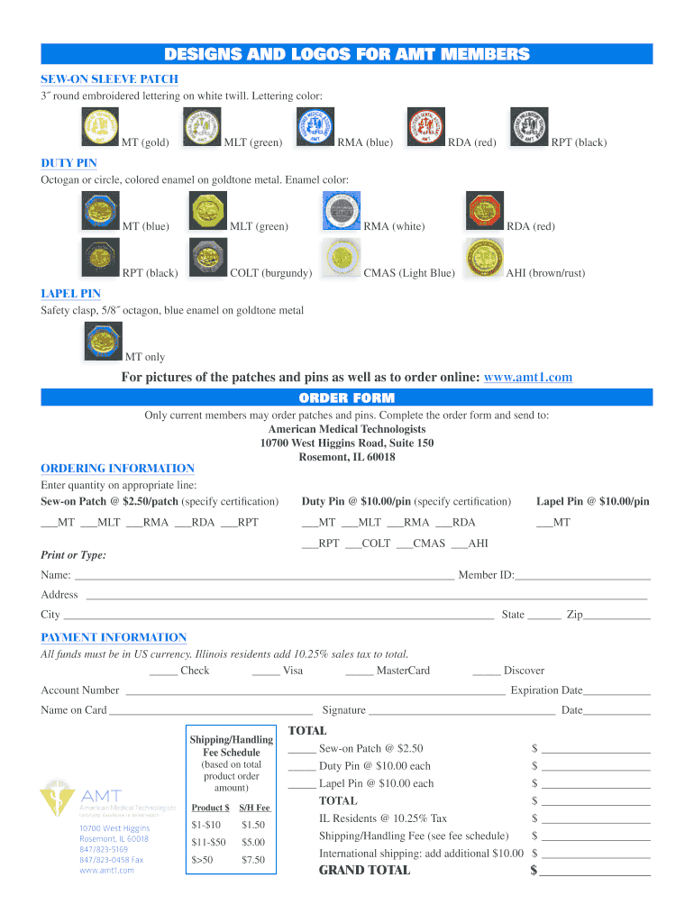 Using the AMT Member Patches and Pins Order Form, you can order sew-on patches, duty pins, and lapel pins that represent the American Medical Technologists.