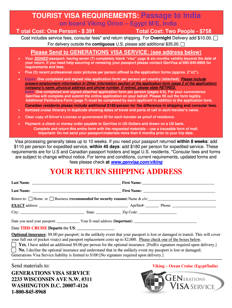 TOURIST VISA REQUIREMENTS: Passage to India on board Viking Orion Egypt M/E, India Total Cost: One Person $ 391Total Cost: Two People $758Cost includes service fees, consular fees* and return shipping.