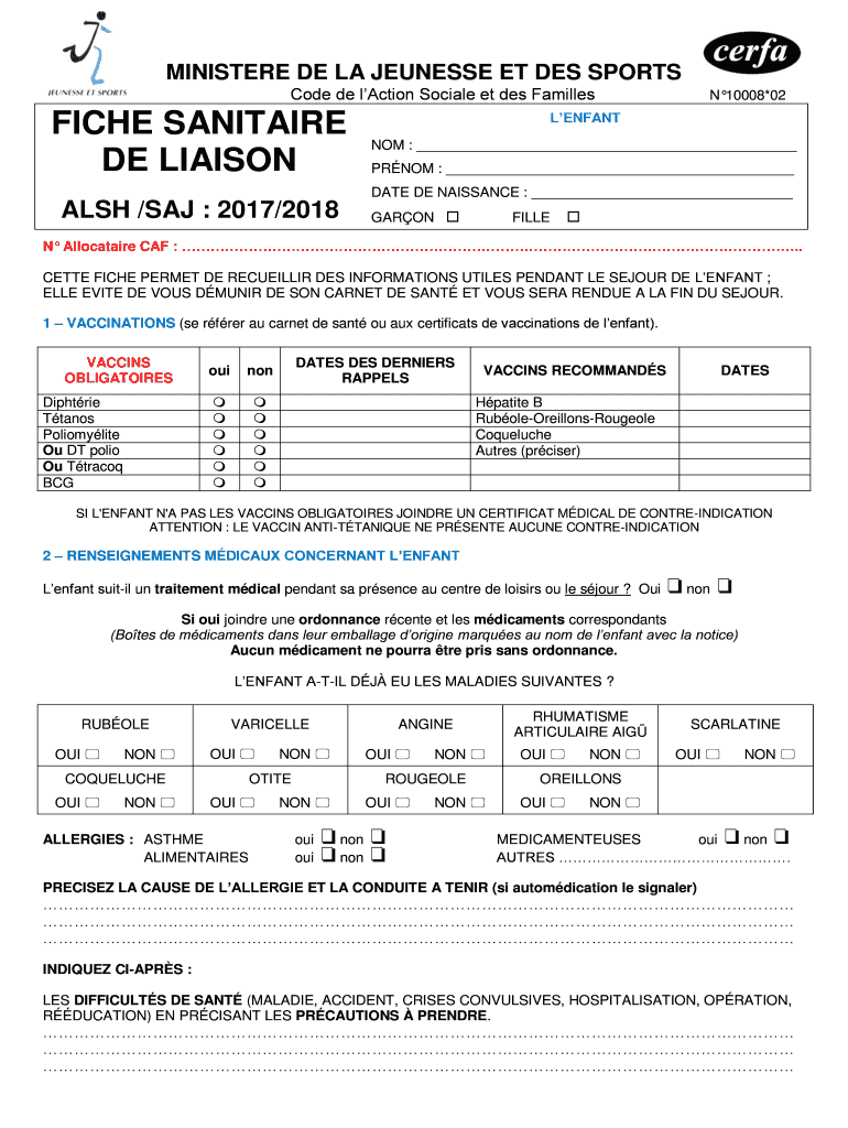 MINISTER DE LA TENNESSEE ET DES SPORTS Code DE action Social et DES FamillesFICHE SANITARY DE LIAISONN10008×02LENFANT NOT : PROM : DATE DE RENAISSANCE : ALSO /SAJ : 2017/2018GARON FILLED Allocatable