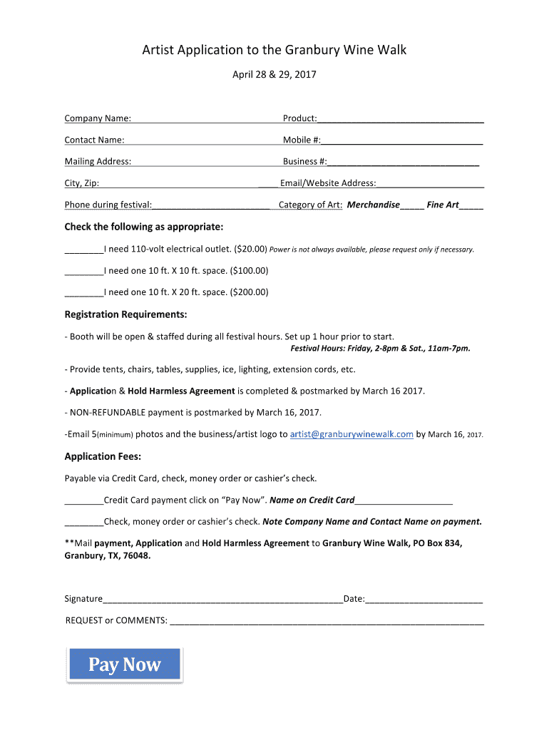 Artist Application to the Gran bury Wine Walk April 28 & 29, 2017Company Name:Product: Contact Name:Mobile #: Mailing Address:Business #: City, Zip: Email/Website Address: Phone during festival: Category