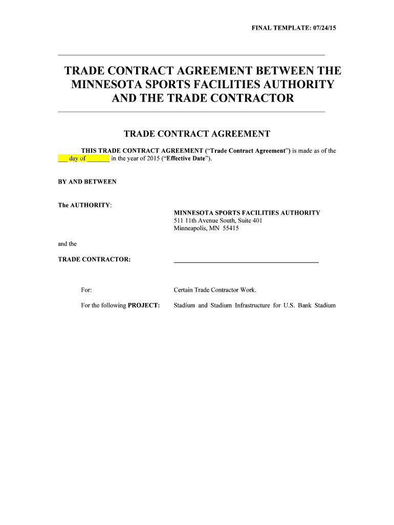 FINAL TEMPLATE: 07/24/15 TRADE CONTRACT AGREEMENT BETWEEN THE MINNESOTA SPORTS FACILITIES AUTHORITY AND THE TRADE CONTRACTOR TRADE CONTRACT AGREEMENT THIS TRADE CONTRACT AGREEMENT (Trade Contract