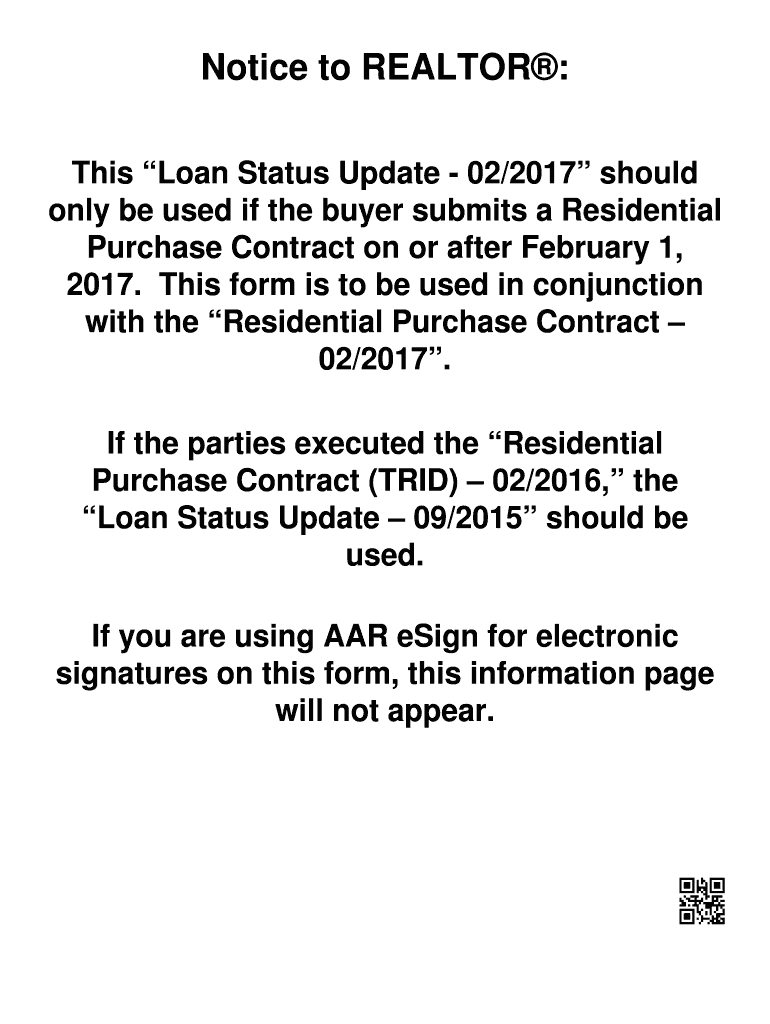 Notice to REALTOR: This Loan Status Update 02/2017 should only be used if the buyer submits a Residential Purchase Contract on or after February 1, 2017. This form is to be used in conjunction with