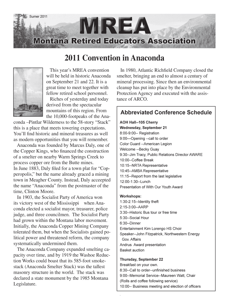 Summer 2011 Montana Retired Educators Association 2011 Convention in Anaconda This year's AREA convention will be held in historic Anaconda on September 21 and 22. It is a great time to meet together