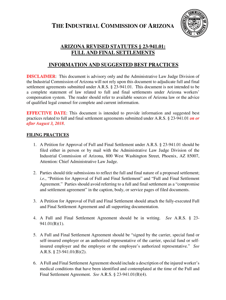 THE INDUSTRIAL COMMISSION OF ARIZONA REVISED STATUTES 23941.01: FULL AND FINAL SETTLEMENTS INFORMATION AND SUGGESTED BEST PRACTICES DISCLAIMER: This document is advisory only and the Administrative
