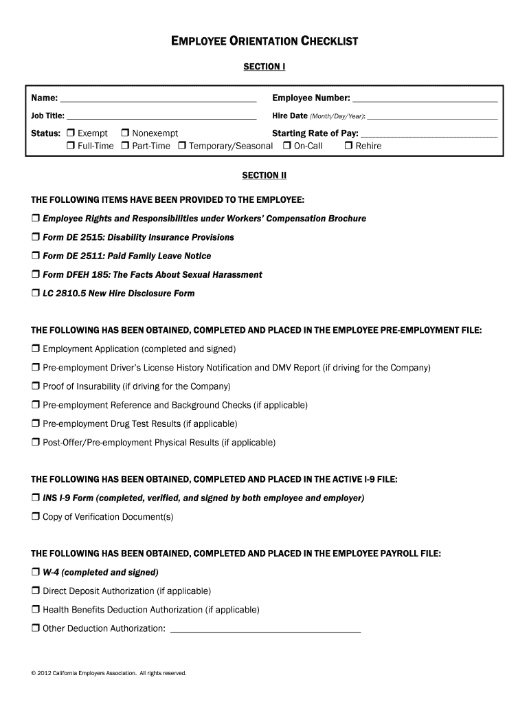 The Employee Orientation Checklist is a new hire paperwork document used by employers in California to ensure all onboarding steps are completed.