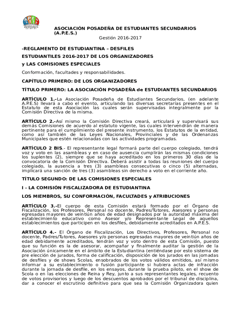 ASSOCIATION PASADENA DE ESTUDIANTES SECONDARIES (A.P.E.S.) Getting 20162017 REGIMENT DE ESTUDIANTINA DEFILES ESTUDIANTILES 20162017 DE LOS ORGANIZADORES y LAS COMMISSIONED ESPECIAL ES Conformation,