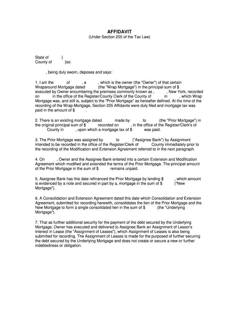 AFFIDAVIT (Under Section 255 of the Tax Law) State of County of SS:, being duly sworn, deposes and says: 1. I am the of, a , which is the owner (the Owner “) of that certain Wraparound Mortgage