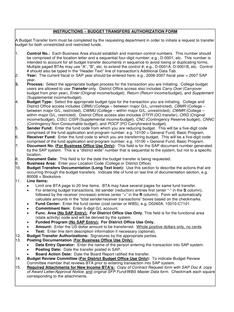 Budget transfer form instructions provide guidelines on how to transfer funds from one budget line item to another.
