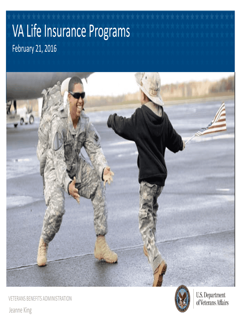 VA Life Insurance Programs February 21, 2016VETERANS BENEFITS ADMINISTRATION Ruth Bedchamber, Jeanne King Insurance Specialist, VA Insurance CenterCustomer Base 6.5 million Insured 2.3 Million Service