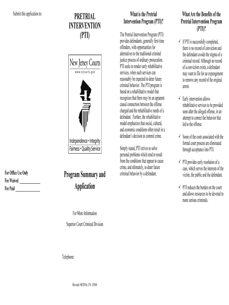 Submit this application to:For Office Use Only Fee Waived Fee Paid PRETRIAL INTERVENTION (PTI)Program Summary and Application For More Information Superior Court Criminal DivisionTelephone:Revised: