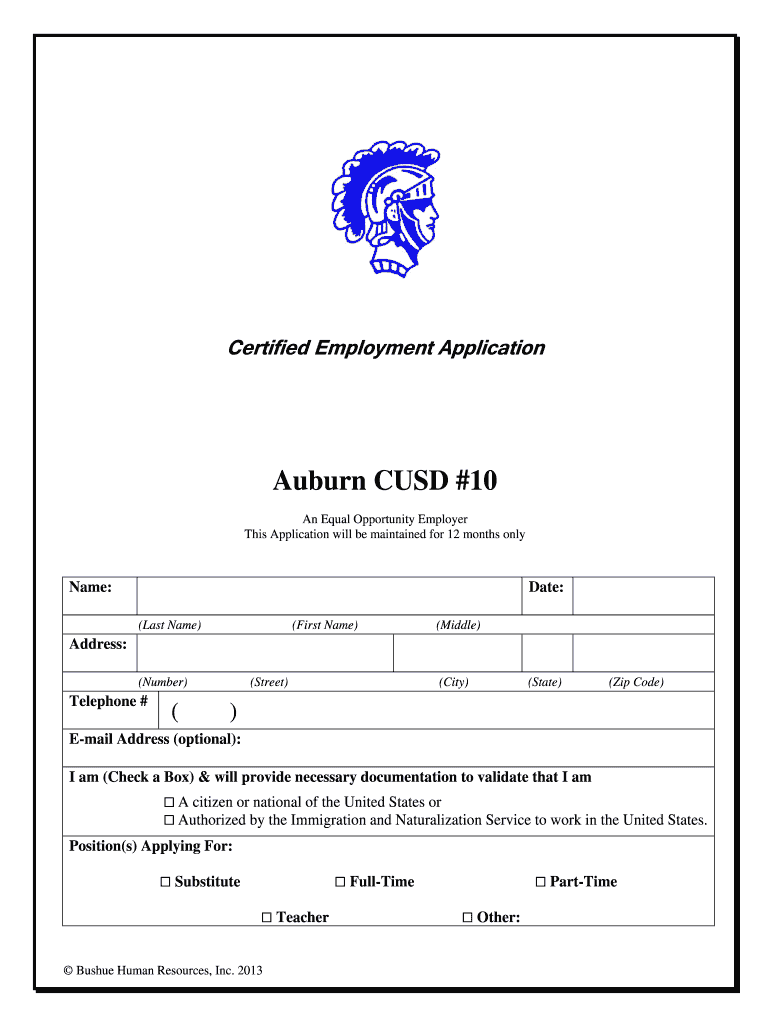 The Certified Employment Application is a document used by Auburn CUSD #10 for job applicants to provide personal information and employment history.