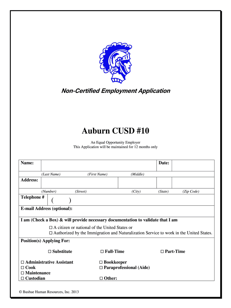 Non-Certified Employment Application Auburn CUSP #10 An Equal Opportunity Employer This Application will be maintained for 12 months only Name: Date: (Last Name) (First Name) (Middle) Address: (Number)