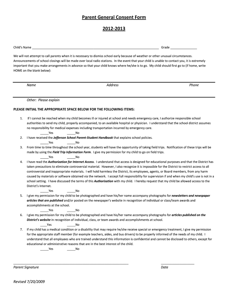 Parent General Consent Form 2012?2013 Child s Name Grade We will not attempt to call parents when it is necessary to dismiss school early because of weather or other unusual circumstances. Announcements